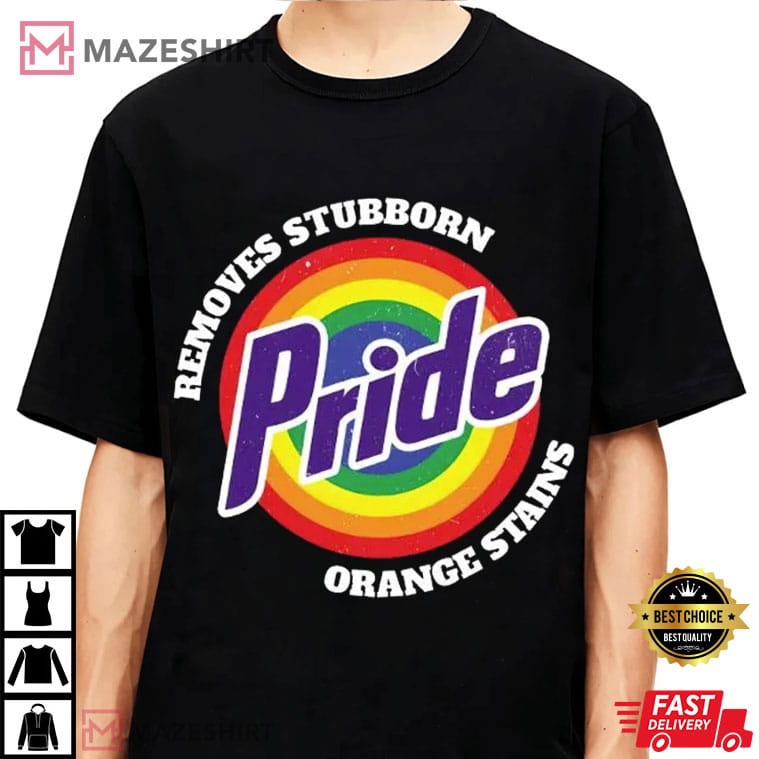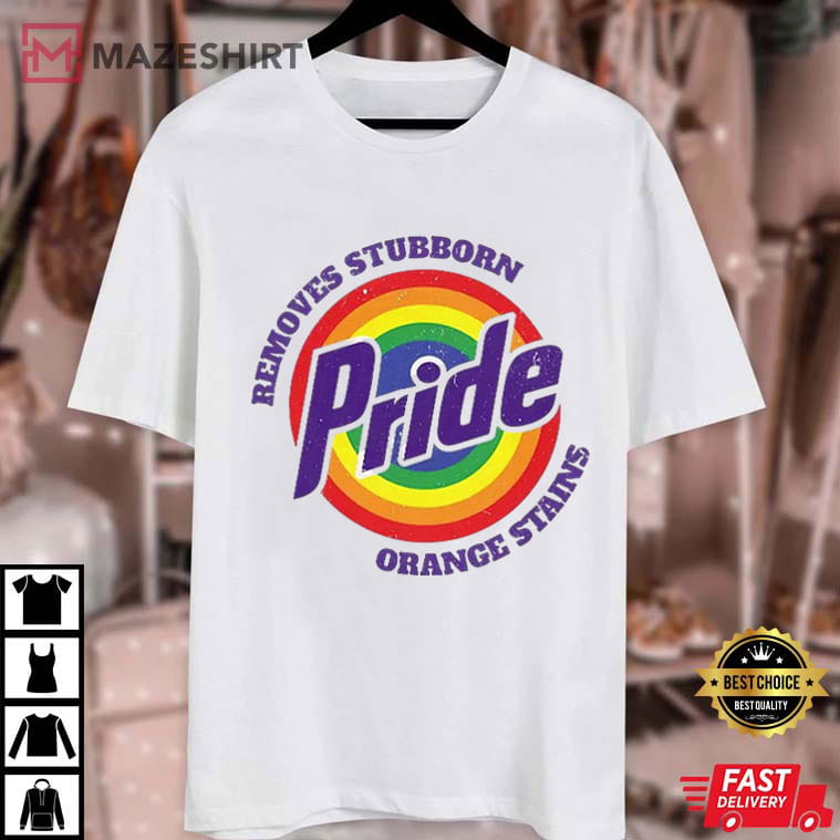 The LGBTQ pride clothes say “Removes Stubborn Orange Stains” in big, bold letters across the middle, with “Pride” in purple letters that stand out. This is the ideal mix of political satire and things that are recognizable to everyone.