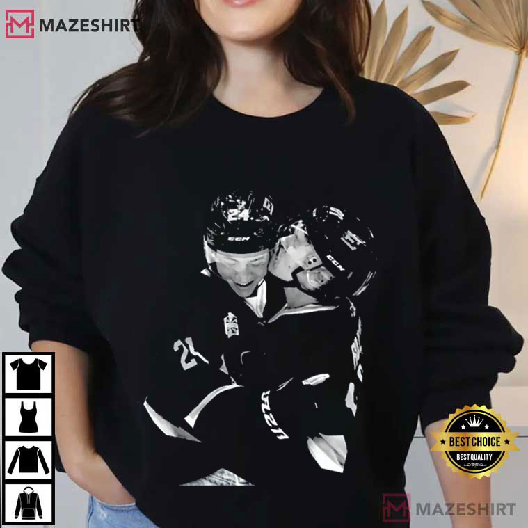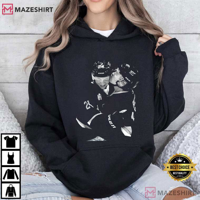 A close-up of Rozanov and Shane Hollander on the ice in the middle of the shirt shows them hugging after the crash. There is no color on purpose. Black and white takes away distractions and leaves only the important things: raw intensity, physical proximity, and the bond that comes from competition and working together.