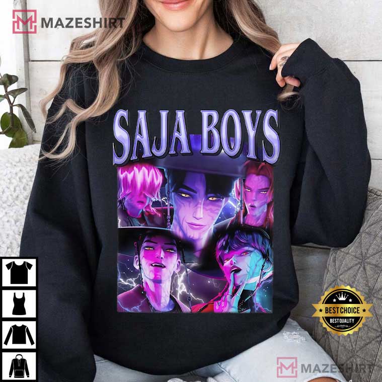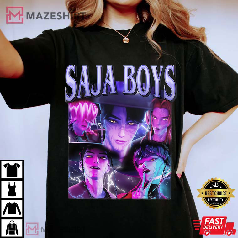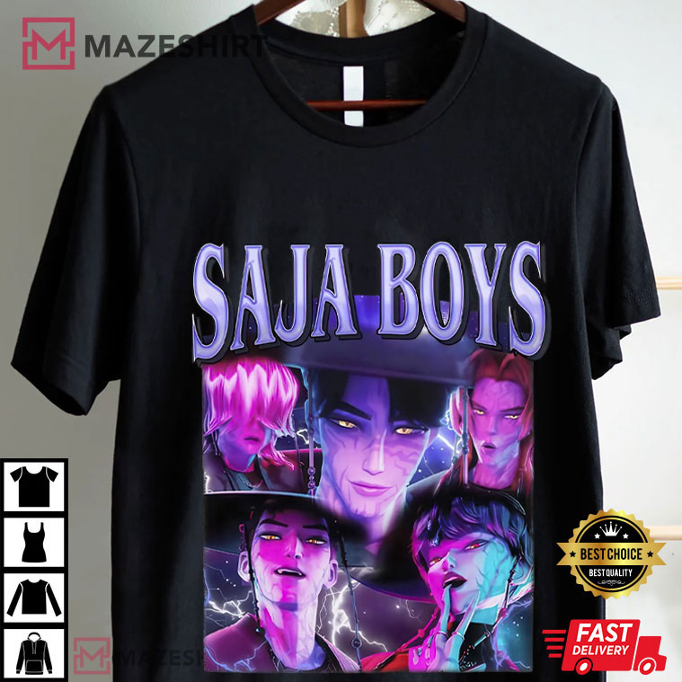 Hey, K-pop fans and movie fans! The Saja Boys Boy Band Kpop Demon Hunters Movie Merch T-Shirt is a must-have for anyone who has been listening to the latest beats and secretly longing for a soundtrack that slays demons. Picture yourself putting on a sleek black tee that screams style with a retro twist. The bold “SAJA BOYS” lettering glows in neon purple, and five exciting characters with smart suits, wild hair, and that unmistakable K-pop flair are all placed against a cosmic background with lightning strikes. It’s like your favorite boy band crashed a supernatural blockbuster, and you get to sit in the front row, or rather, the front-chest area.