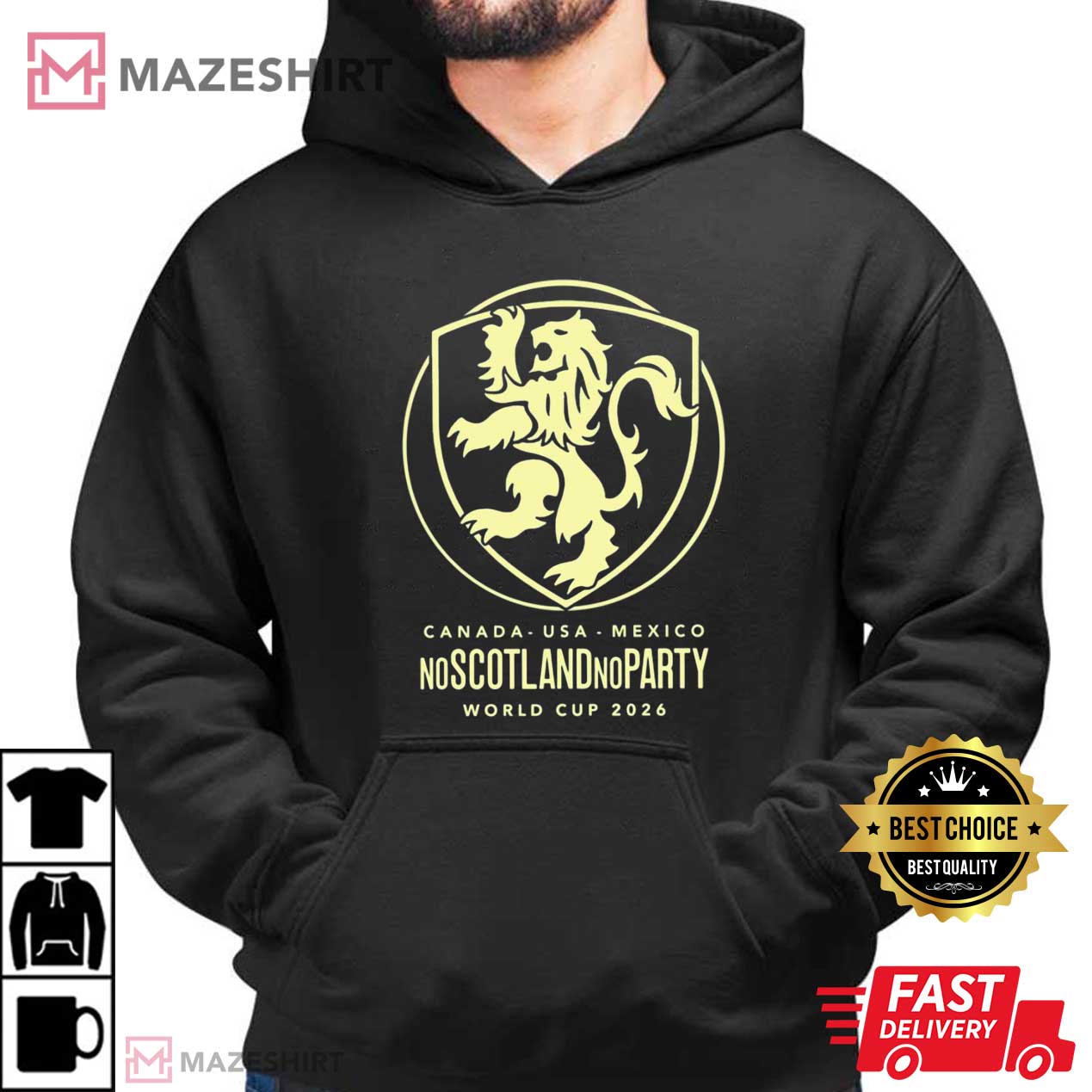 A powerful, stylized Scottish lion crest, based on the famous Lion Rampant, is front and center. It stands for pride, strength, and the love Scottish fans have for the game. The fun slogan “No Scotland No Party” is below. This chant has been a fan favorite in stadia, pubs, and on social media. It states, “When Scotland comes, the mood changes.”