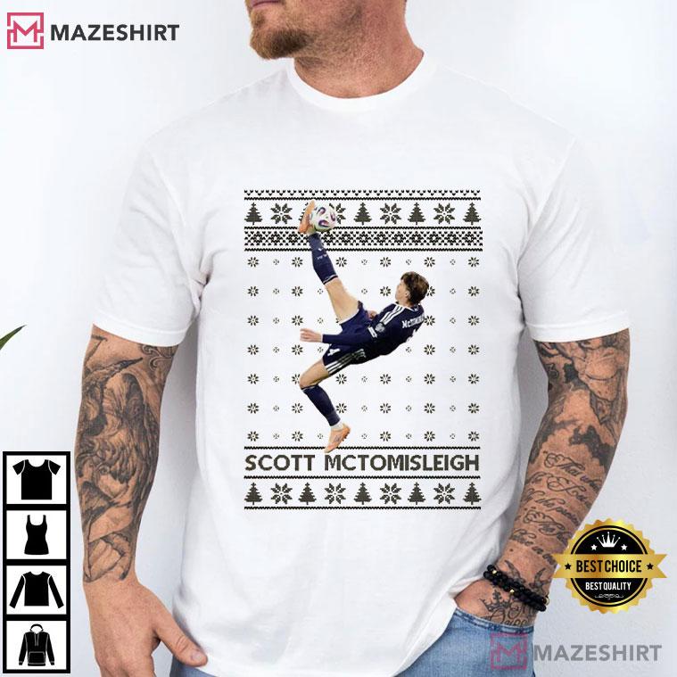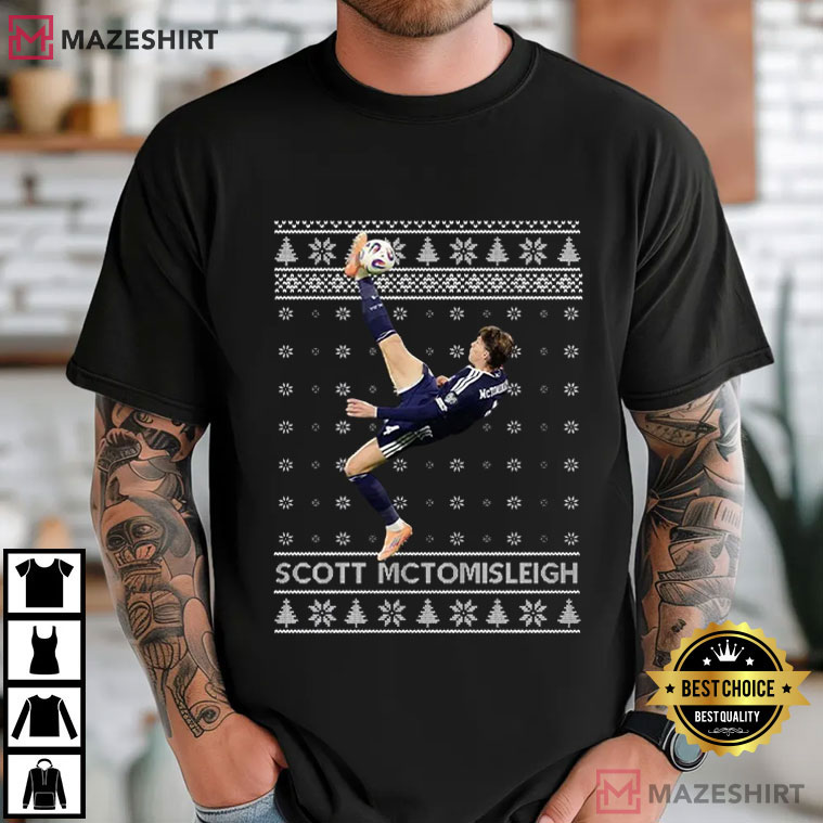 Some football moments stay with fans forever, like those goals that appear to defy gravity and become part of fan folklore right away. This Scott McTominay Christmas Overhead Kick Goal Football T-Shirt captures that feeling perfectly, combining a memorable overhead kick with a Christmas sweater look.
