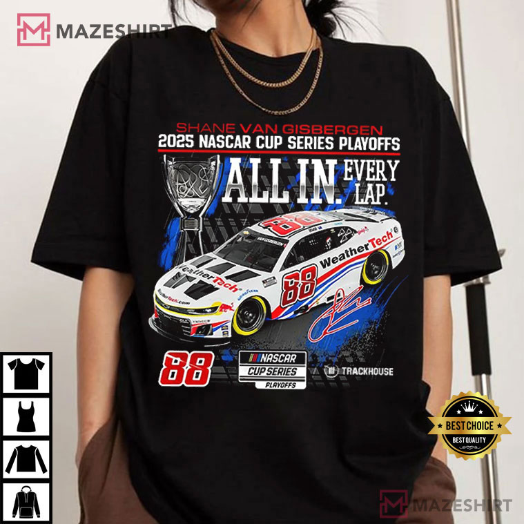 Hey, people who like racing! If you’re looking forward to the fast-paced action of the 2025 NASCAR season, be ready with the Shane Van Gisbergen 2025 NASCAR Cup Series Playoffs T-Shirt. photo a sleek black shirt with a photo of Shane van Gisbergen, who is also known as SVG, driving his iconic No. 88 WeatherTech Chevrolet Camaro. There is a dazzling championship trophy and the words “ALL IN EVERY LAP” on the shirt. The Trackhouse Racing logo, SVG’s trademark, and the bright red, white, and blue colors all over the track all make the design scream speed and determination.