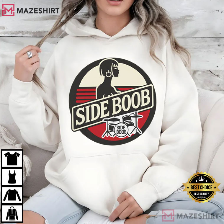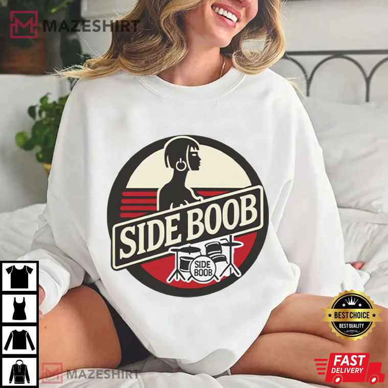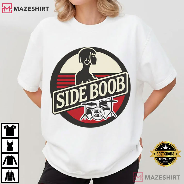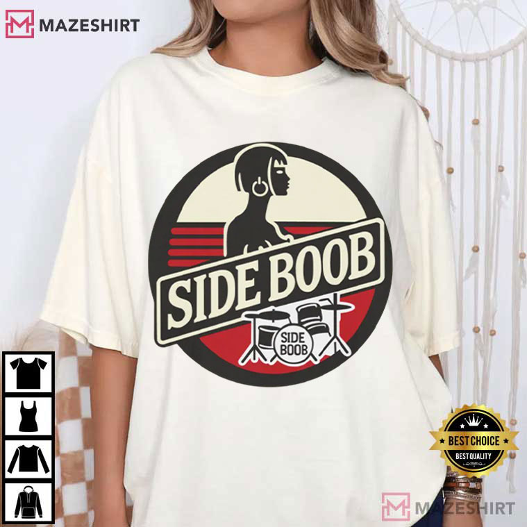 The Sideboob Graphic T-Shirt has a striking graphic design that mixes edgy comedy, classic rock style, and amusing pop culture parody. It gets people’s attention right away. This shirt has a design that is both nostalgic and rebellious. It mixes stylized lettering, a drummer motif, and retro color blocking to make it look like old band logo art that you may find on old event memorabilia.