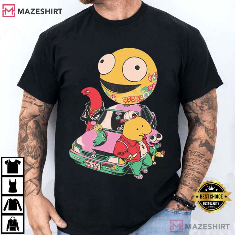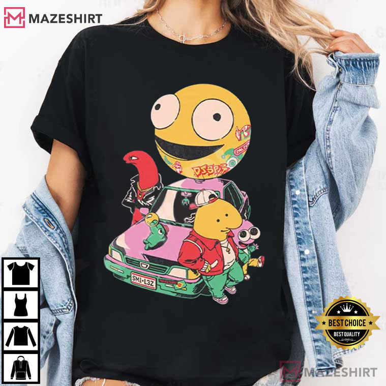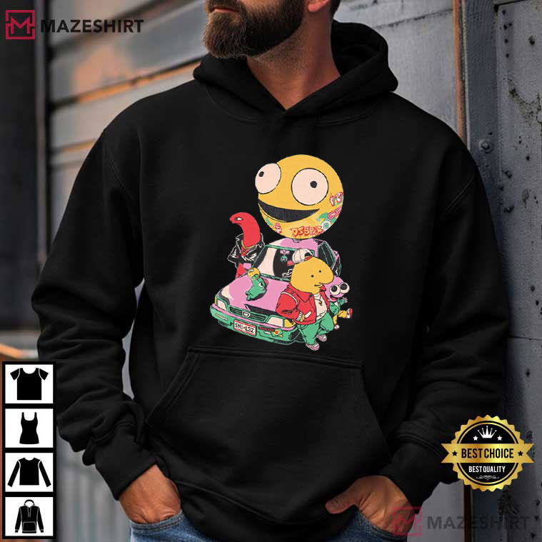 The Smiling Friends Cartoon Characters Fan T-Shirt has a fun and colorful design that is based on one of the most successful modern adult animation comedy. This shirt has a group of strange cartoon figures standing around an old car with a big smiling face hovering above them. It perfectly portrays the chaotic humor and bizarre style that fans know and love.