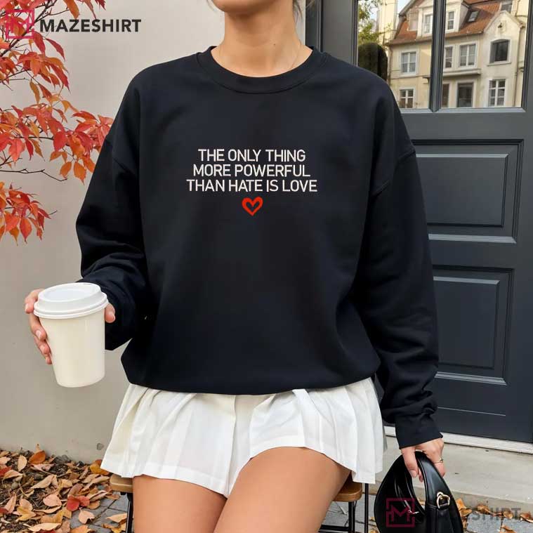 The Social Justice The Only Thing More Powerful Than Hate Is Love Embroidered Sweatshirt is a timeless message in simple, clean type. The phrase is centered on the chest and says: