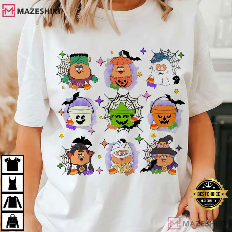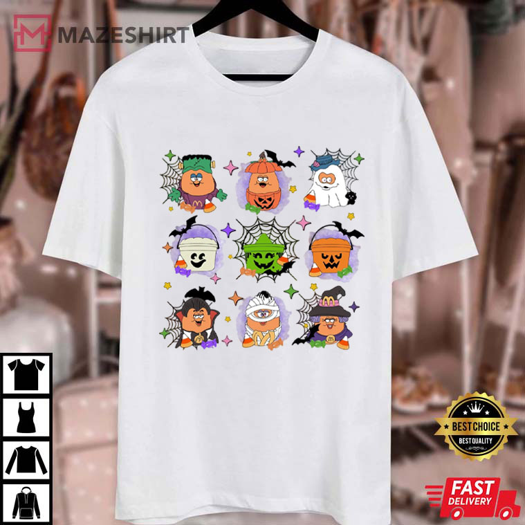 The Spooky Nuggets Meal Bucket Funny Halloween T-Shirt is the best thing to wear for a Halloween season full of fun and fast food! Imagine a soft white tee with a group of your favorite McNugget friends—Frankenstein, Pumpkin, Ghost, Vampire, Mummy, Witch, and more—all dressed up in their scariest costumes and holding miniature meal buckets like it’s trick-or-treat time at the drive-thru.