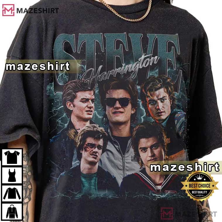 The Steve Harrington Stranger Things 5 Limited Vintage T-Shirt is a tribute to one of the best character arcs on TV in recent years. Not only does this design display Steve, it also tells his narrative. Every iteration of Steve on this tee shows a time when people fell in love with him, from the cocky high school king to Hawkins’ most reliable guardian.