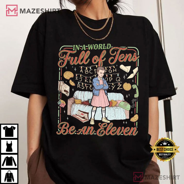 The Stranger Things In A World Full Of Tens Be An Eleven Christmas T-Shirt is a sincere tribute to one of the most famous characters in modern TV history. The design is all about Eleven, who is standing proudly in her usual position and is surrounded by things from the Stranger Things universe, such alphabet letters, Eggo waffles, books, and small details that remind you of Hawkins. The message is clear and strong: don’t fit in; be different.