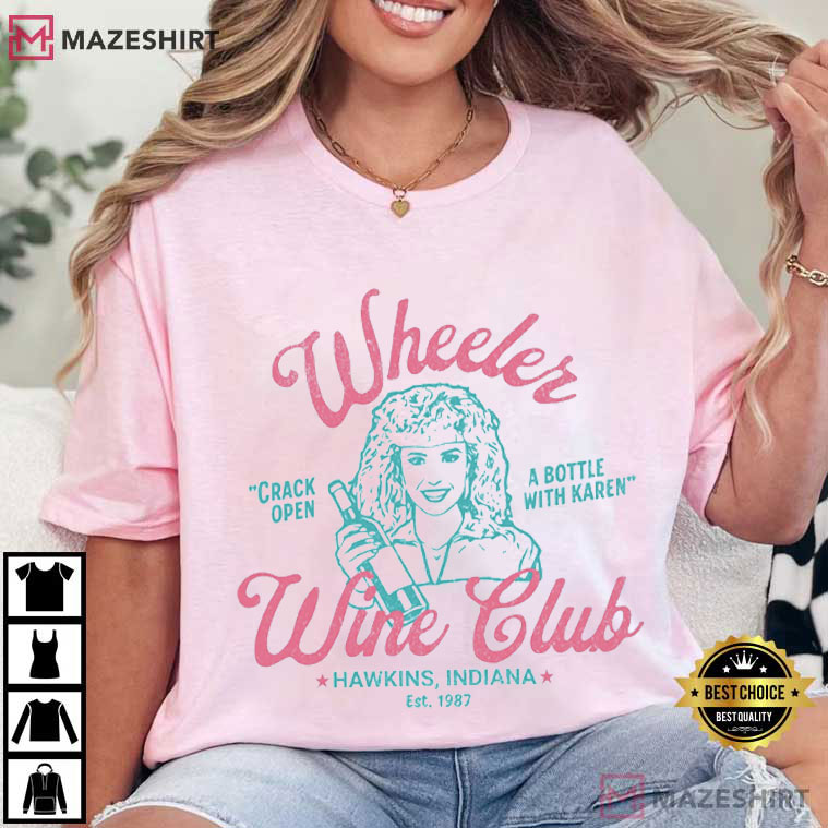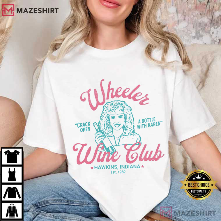 The Strange Things The Karen With Her Wine Hawkins T-Shirt is a fun, retro-style way to honor one of the show’s most surprising memorable characters. The design shows Karen Wheeler smiling and holding a wine bottle. It seems like an old-fashioned club logo with the words “Wheeler Wine Club – Hawkins, Indiana – Est. 1987.” Fans will recognize it right away since it’s fun and tongue-in-cheek.