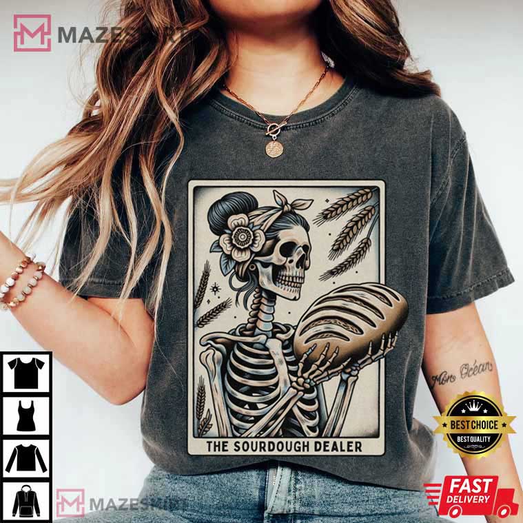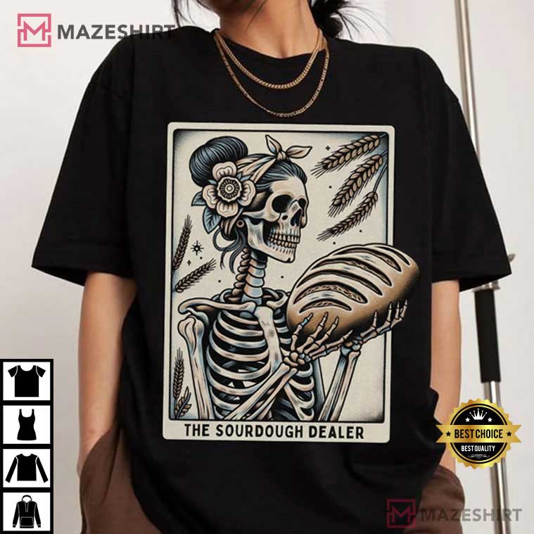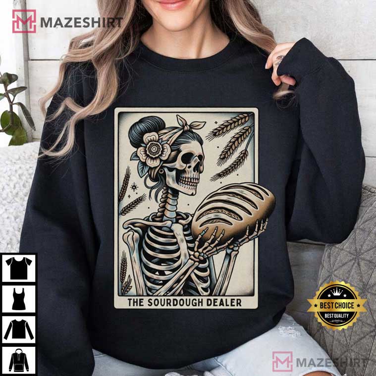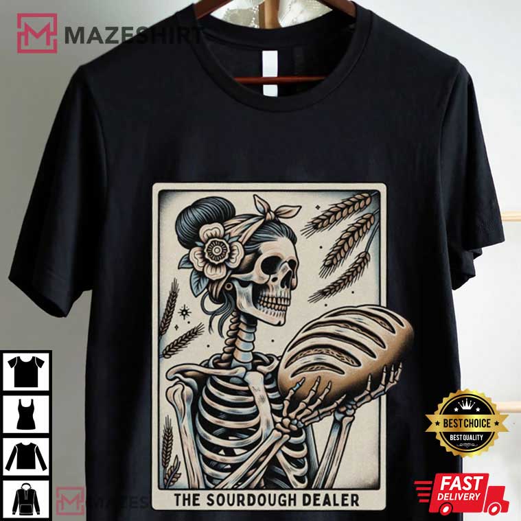 The Tarot Card The Sourdough Dealer Bread Halloween T-Shirt has just the right amount of eerie, hilarious, and kitchen-inspired charm to make your Halloween 2025 more fun! The “Sourdough Dealer” is written in scary orange lettering on this black shirt with a styled tarot card design. The design features a skeleton with a smile kneading dough under a full moon, along with loaves of bread and a table covered with flour. The cobwebs and jack-o’-lantern make it plain that it’s Halloween, and the retro tarot style is a charming nod to fortune-telling.
