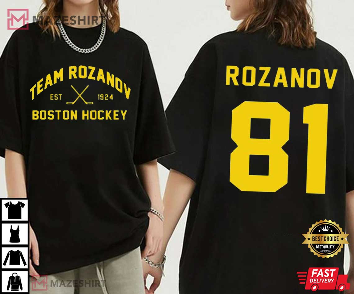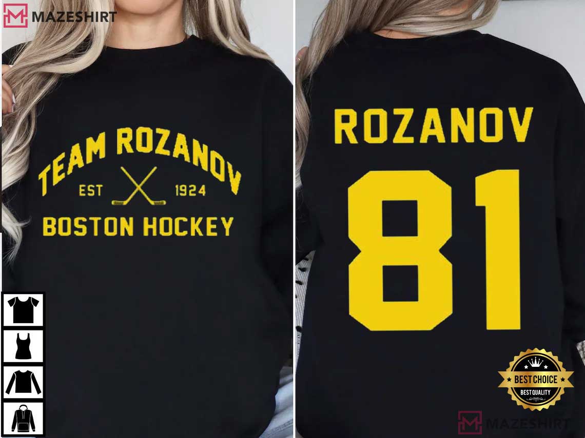 The Team Ilya Rozanov 81 Boston Hockey Heated Rivalry T-Shirt is made like a classic hockey jersey tee: clean, bold, and easy to spot. This jersey has varsity-style letters on the front and the famous ROZANOV 81 on the back. You can pick a side and wear it with pride.