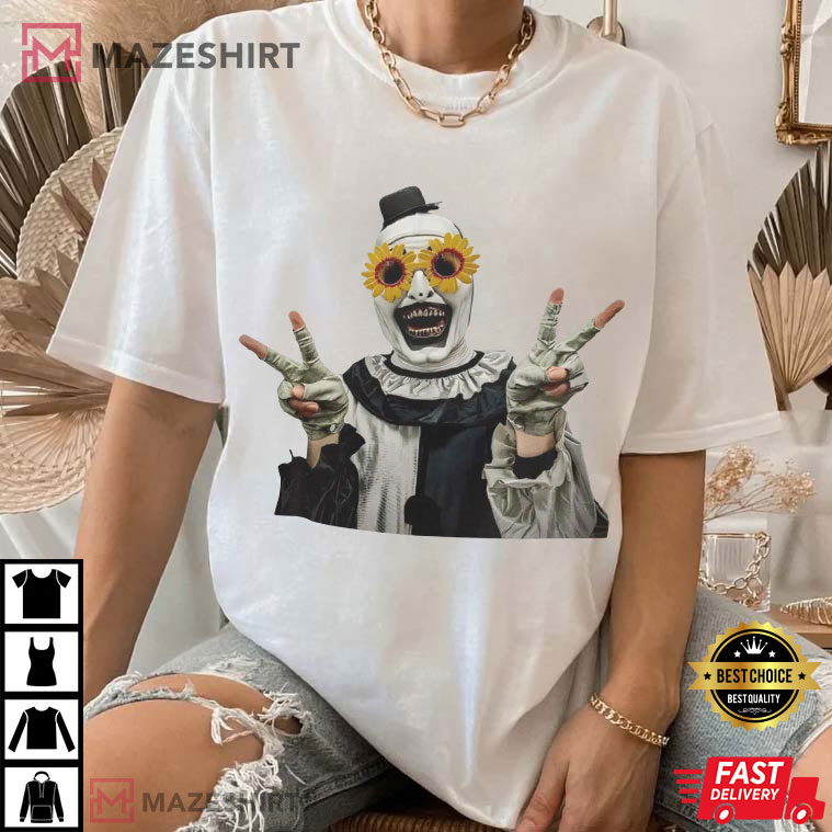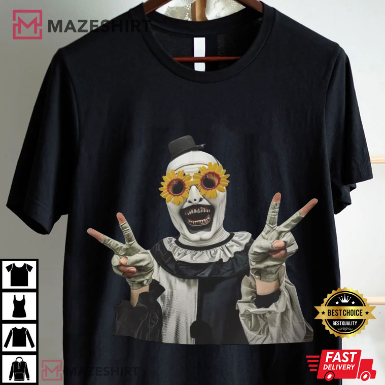 Are you ready to let your evil side out this Halloween? The Terrifier Clown Halloween Horror Movie T-Shirt is here to help you get ready for Halloween! This shirt is great for people who love horror, Halloween, or just a little bit of scary fun. It has the spine-chillingly famous Art the Clown on it. This Terrifier Clown T-Shirt makes a bold statement and adds a touch of spooky humor to your wardrobe, whether you’re going to a horror convention, a Halloween party, or just watching slasher movies at home.