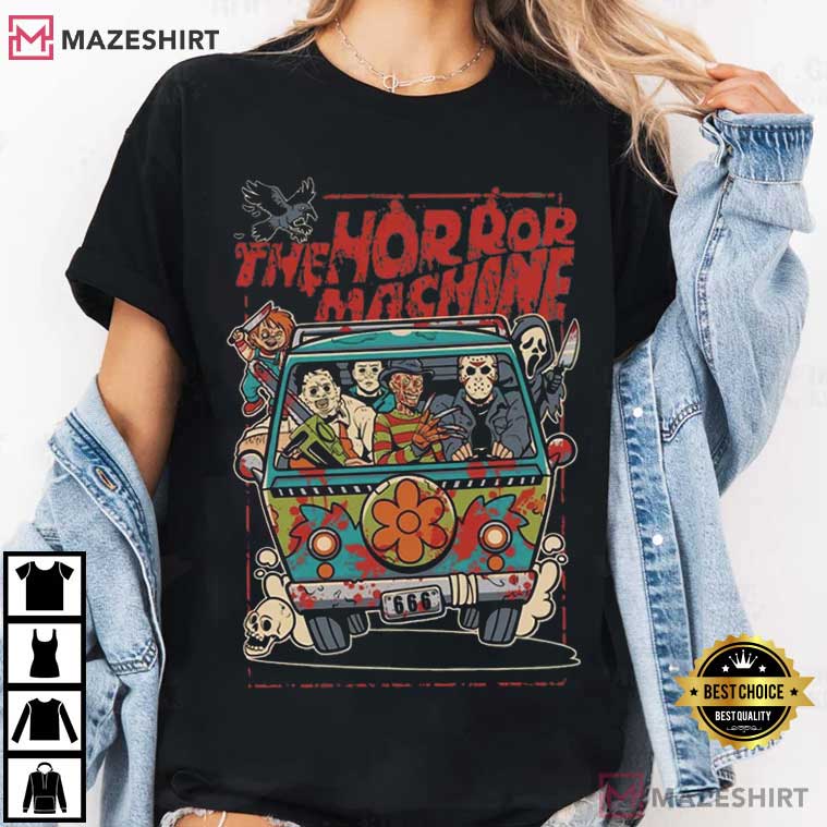 Hey, horror fans and anyone that love Halloween! If you’ve ever felt your heart racing while going through the scary corridors of Universal Studios’ Halloween Horror Nights, the The Horror Machine Halloween Universal Studios Scary Movie T-Shirt is next thing you need. This isn’t just a tee; it’s a ticket to the fear, a wearable tribute to the scary things that happen over the season, straight from the heart of Universal’s spook fest.