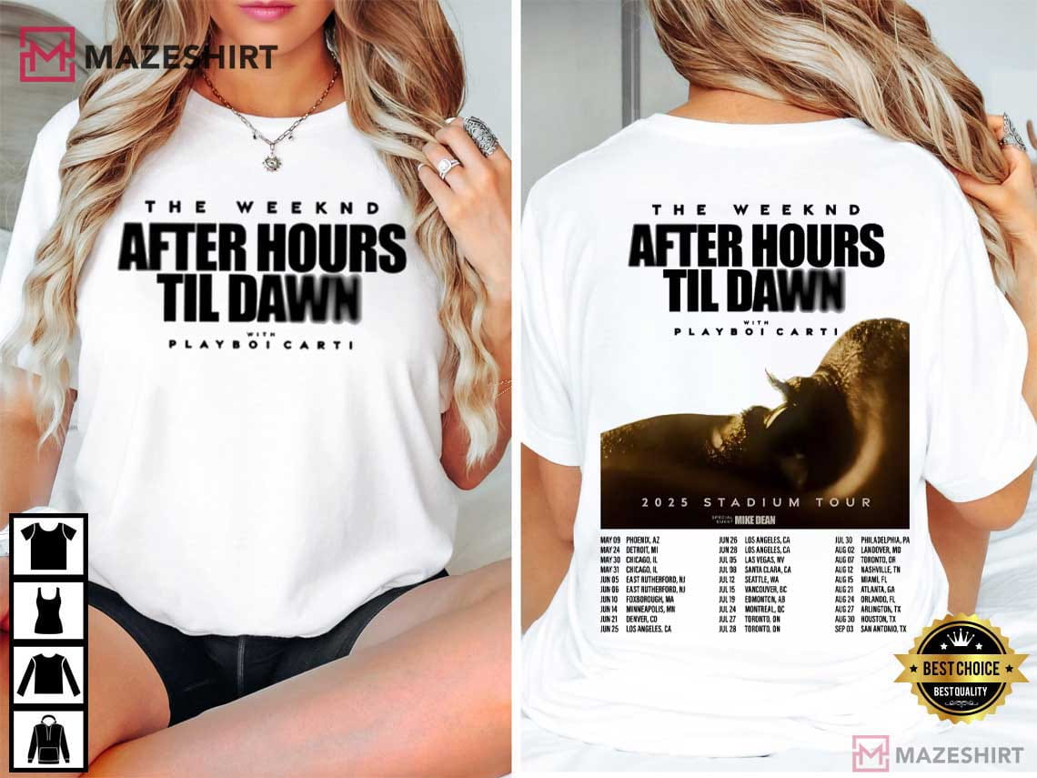 Explore the wonder of the The Weeknd After Hours Til Dawn 2025 Music Tour T-Shirt! Featuring strong black writing on the front reading “The Weeknd After Hours Til Dawn,” this white shirt honors The Weeknd’s legendary 2025 stadium tour with Playboi Carti. The back has a clean design with tour dates from Phoenix to San Antonio. Soft cotton makes it ideal for late-night jam sessions, casual hanging, or concerts.