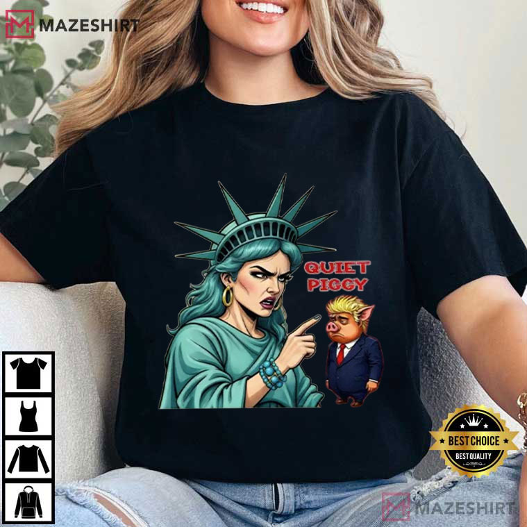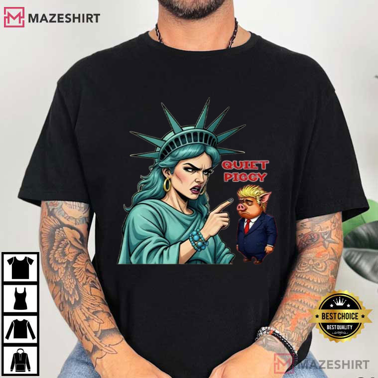 The Trump Quiet Piggy Liberty Edition Graphic T-Shirt combines strong political satire to make comments on well-known icons. This shirt mixes pop-art illustrations with modern political comedy to get people thinking as well as talking. It’s easy to spot and hard to ignore. It’s not subtle, and that’s on purpose.