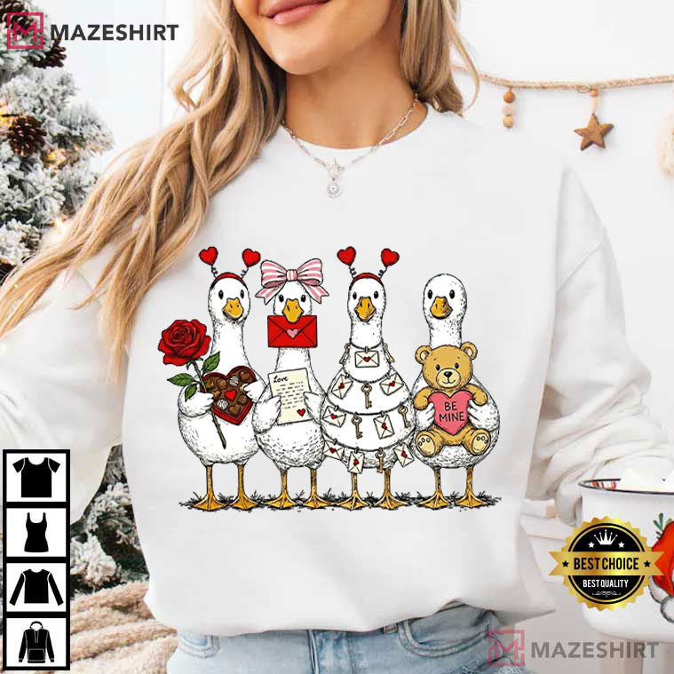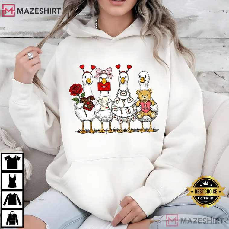 The Valentines Day Goose Pink Funny T-Shirt takes the standard Valentine’s Day romance and makes it more charming and a touch strange. With a line of cute geese dressed up for love and bearing roses, messages, chocolates, and a teddy bear, this design portrays the lovely, uncomfortable, and sincere atmosphere that makes Valentine’s Day enjoyable instead of cheesy.