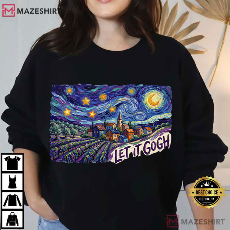 The Van Gogh “Let It Gogh” Art Aesthetic Painting T-Shirt is a piece of art that quickly connects with people who like art with personality, comedy, and significance. It combines famous works of art with a current, feel-good message, making it great for everyone who likes art and a little bit of lighter insight.