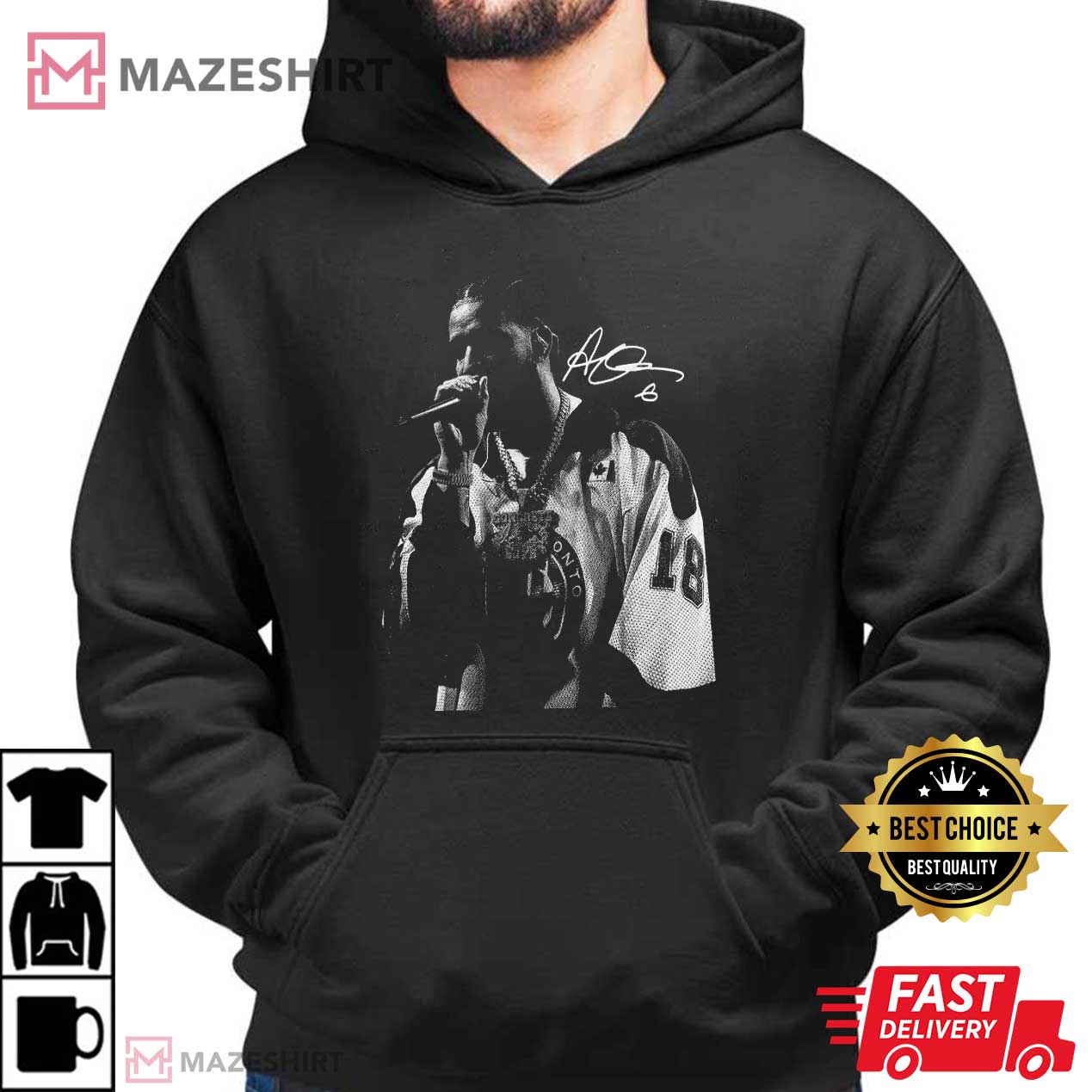 This Vintage Drake Rap Merch Fan Gift T-Shirt is a striking image that combines old-school hip-hop style with modern fan culture. The design has a black-and-white, grainy picture of a rapper holding a mic that looks like a concert photo from the 1990s. The tee has that real “tour merch” look that fans enjoy because of the halftone effect, the big jersey, the hefty chain, and the signature-style overlay.
