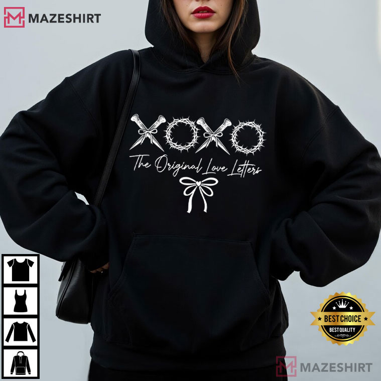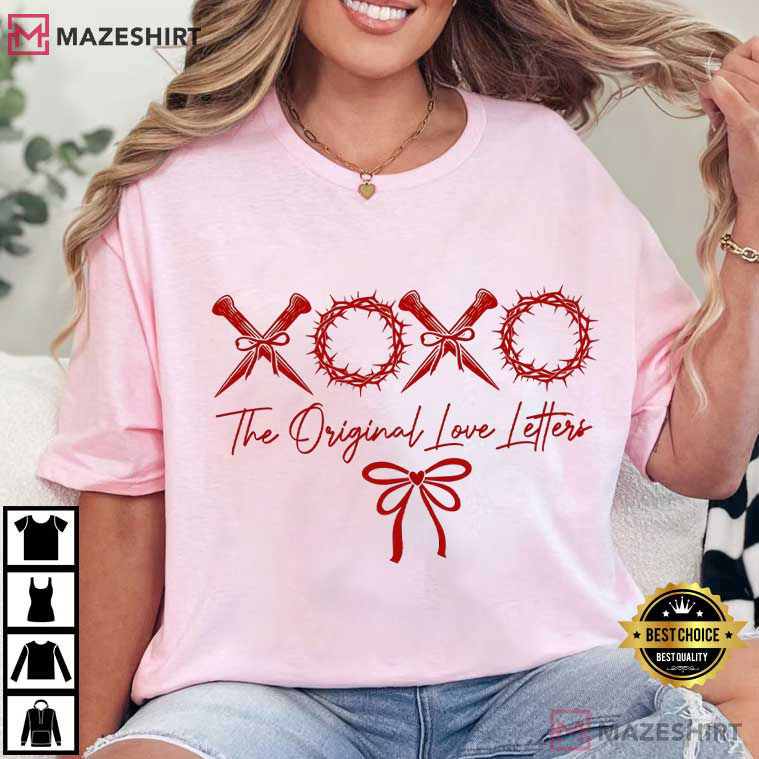 The Original Love Letters XOXO The Jesus Christian Valentine T-Shirt is a faith-based design that looks at love from a spiritual point of view. It combines well-known Valentine’s Day symbols with Christian meaning to remind the person wearing it that the most powerful expression of love was penned long before cards, roses, or chocolates.