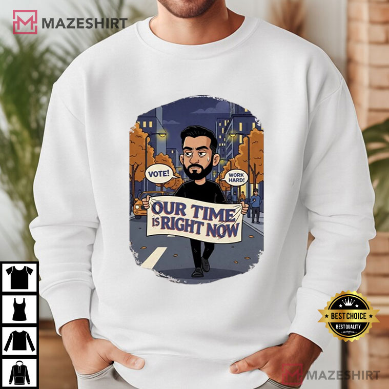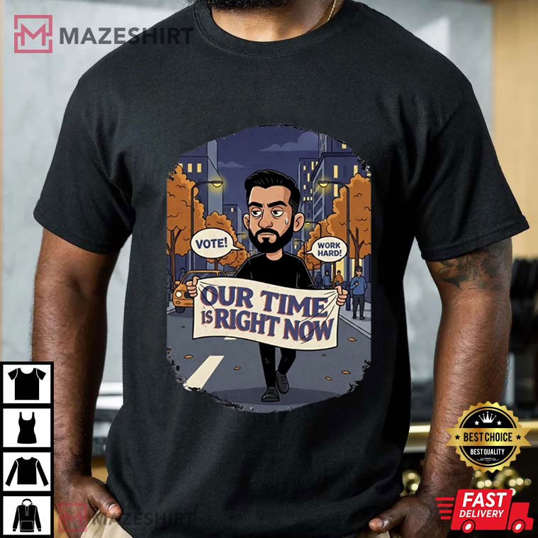 In the middle is a stylized picture of Zohran Mamdani striding along a New York street with a banner that says “Our Time Is Right Now.” There are subtle but significant things around him, like speech bubbles that shout “Vote!” and “Work Hard,” that make the point that progress doesn’t come from waiting; it comes from showing up.